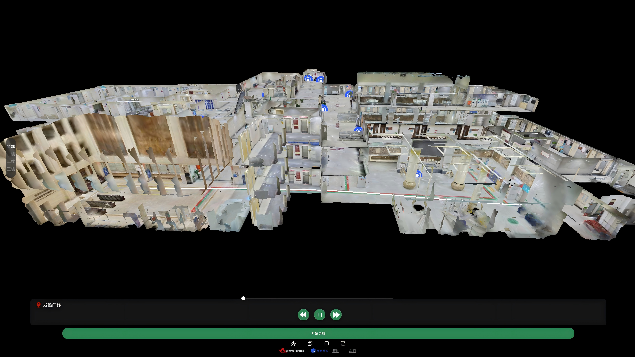 通過眾趣科技自研的高精度激光掃描儀與 AI 算法,可在短時間內快速完成對醫院大樓全域空間的厘米級精度掃描與重建。各科診室、藥房、電梯間、衛生間……醫院內每一處地點都被精準復刻,構建起一個與醫院物理空間 1:1 映射的三維數字孿生體。這不僅是一個三維實景模型,更是承載醫院空間信息與業務邏輯的動態數字底座。