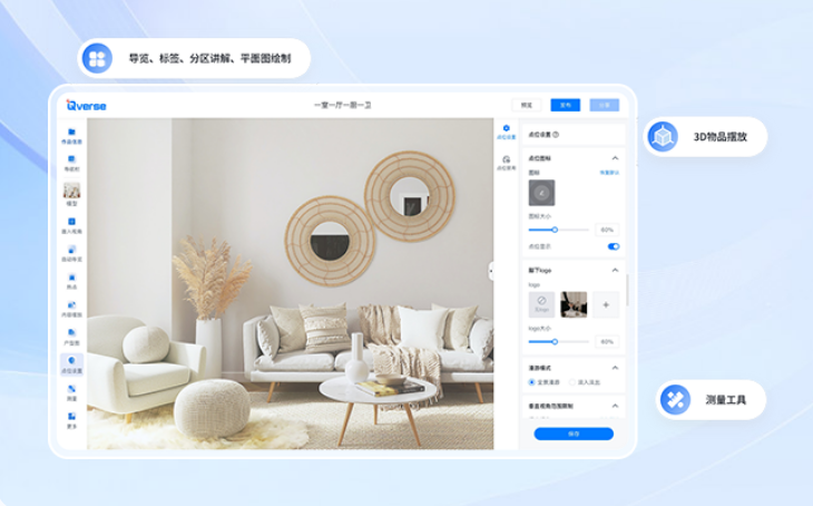 在構建數字空間之外,Qverse 三維空間云平臺更在意的是如何通過數字空間滿足用戶的個性化需求。因此,在具體功能設計上,涵蓋了營銷傳播及垂直行業的各類精細化領域的空間數字化需求,真正實現從空間建模到空間編輯再到行業應用的全鏈路空間管理。