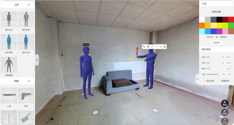 通過眾趣科技 A300 Pro 可快速還原案發現場,實現 720° 沉浸式漫游。同時,結合采集到的真實三維數據,A300 Pro 可基于三維案場隨時隨地進行尺寸測量。此外,基于 AI 算法能力,智能生成犯罪現場示意圖,根據案件走向,可在實景空間內模擬演示事件經過和事件進展,支持插入 3D 數字人、兇器、血跡等交互標簽,推演犯罪現場,強化犯罪現場與關鍵物證、人證的關聯,推動案情進展。