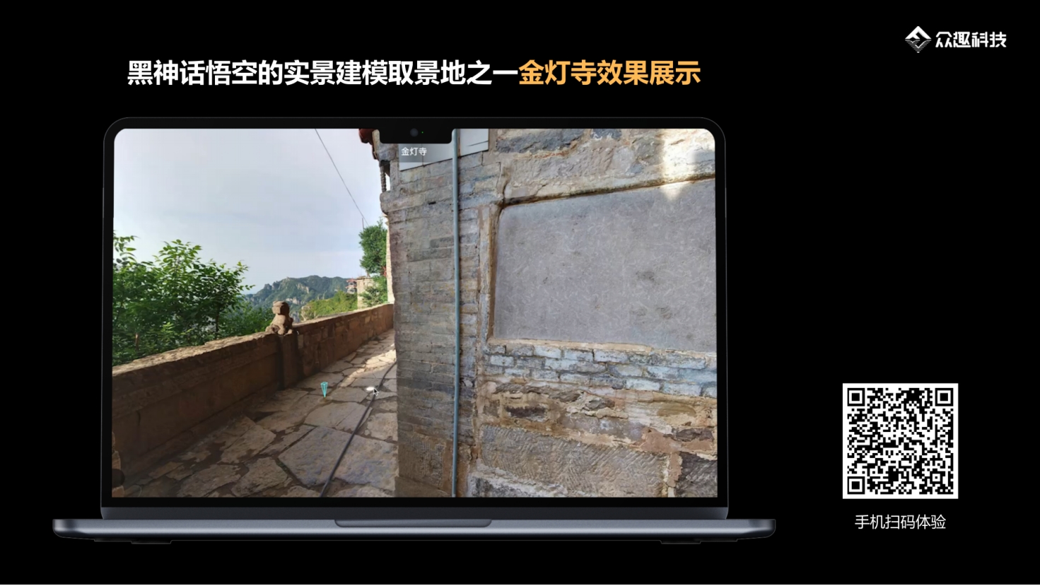 以《黑神話:悟空》的取景地之一山西金燈寺為例,通過眾趣科技的空間計算和實景三維技術,用戶不僅可實現全場景的沉浸式漫游,同時,結合 Qverse 三維空間云平臺提供的熱點標簽、空間測量等功能進一步加深用戶對金燈寺的深入了解。