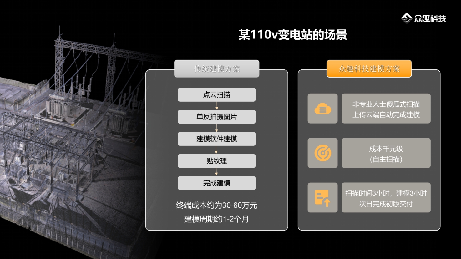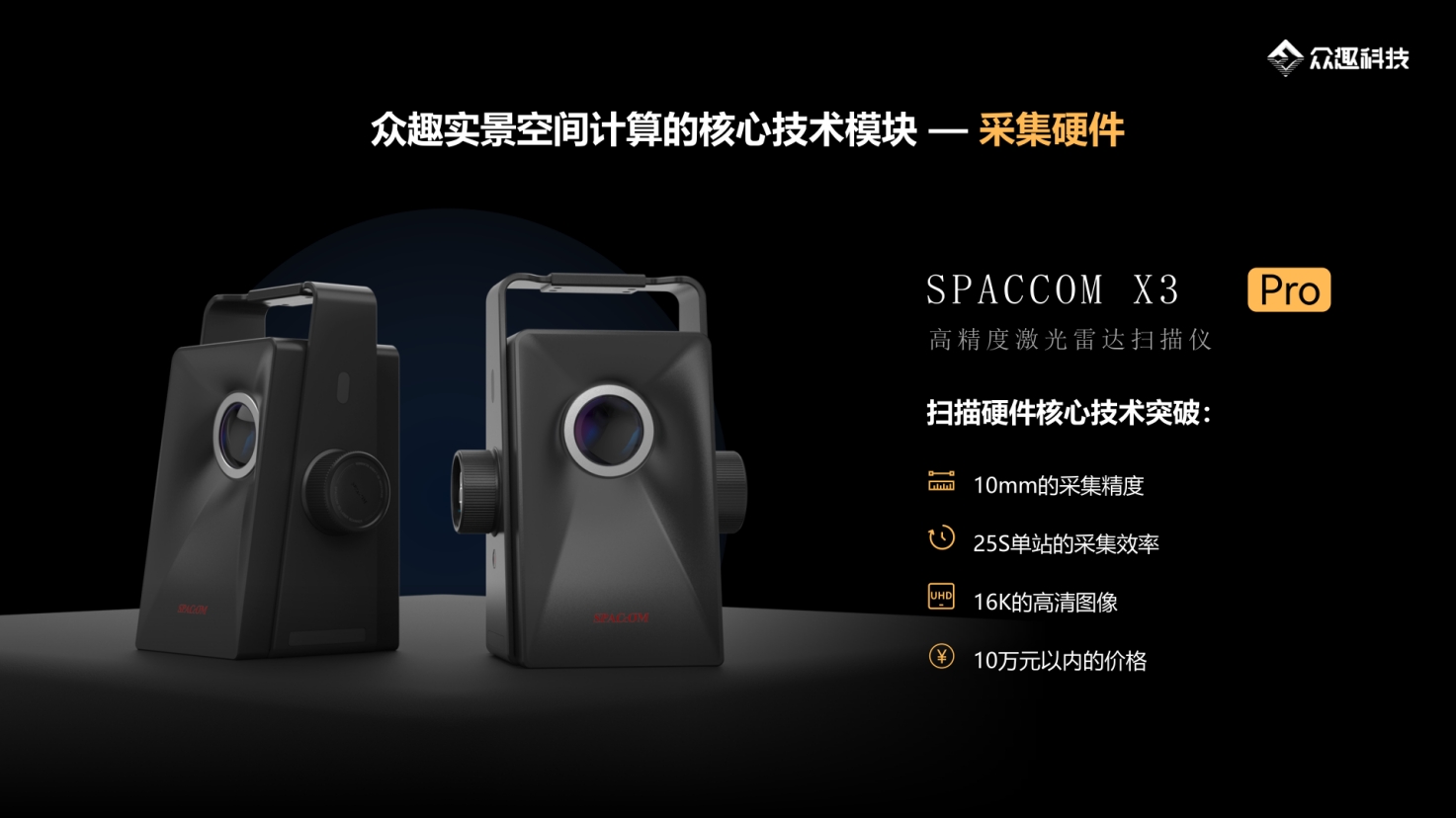 具體來看,相較傳統的建模方式,眾趣科技的實景建模方式可以有效解決建模成本高、高空與地面難融合、難以輕量化訪問等痛點,通過眾趣科技自研的 SPACCOM 系列激光掃描儀快速采集空間三維點云數據,依托自研的 3D 視覺算法和 AI 機器三維視覺算法快速構建三維立體空間,支持導出 VR 鏈接、mesh 模型、通用的點云文件、高清圖片以及 CAD 和 BIM 的工程文件等豐富數據格式。同時,通過空地一體化技術實現高空-地面-室內的全域耦合,構建全域可視化 3D 實景空間。