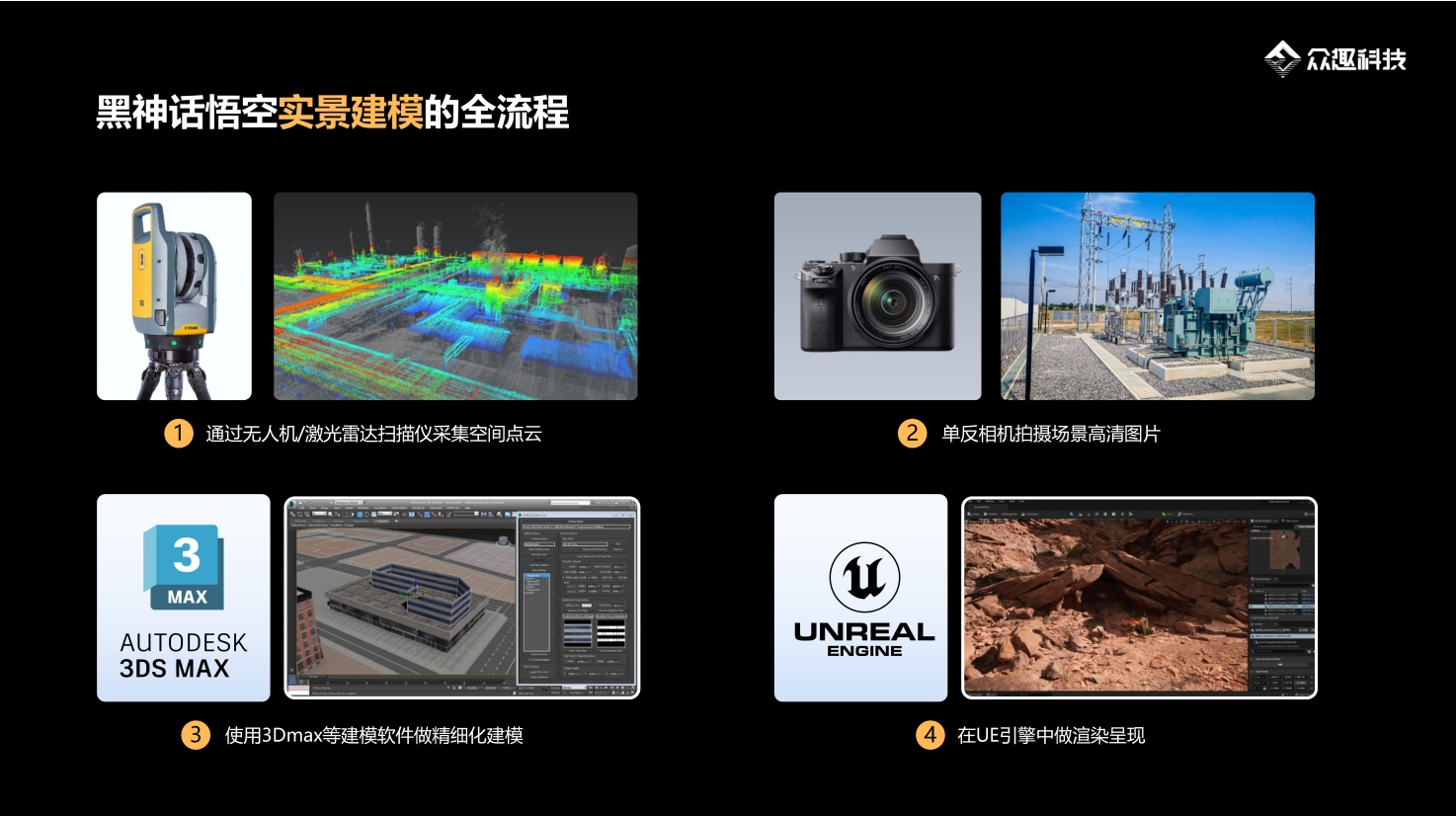 眾趣科技也借此向與會人員分享了《黑神話:悟空》的實景建模過程——即通過無人機、激光雷達掃描儀進行空間點云采集,獲取精確的空間數據;接著使用單反相機拍攝現場高清圖片,捕捉豐富的細節信息;然后利用 3Dmax 等建模軟件進行建模,構建出三維模型;最后通過 UE 引擎進行渲染呈現,使游戲場景更加生動逼真。