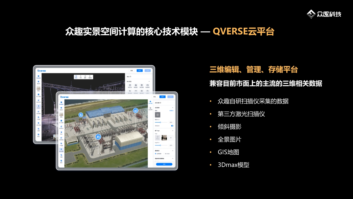 值得一提的是,除自研高精度激光掃描設備外,眾趣科技的 Qverse 三維空間云平臺可兼容市面上主流的三維相關數據,除眾趣自研掃描儀的數據以外,可兼容第三方激光掃描儀、傾斜攝影、全景照片、GIS 地圖、3Dmax 模型文件等,實現數據的共通共享,真正實現實景三維模型從采到用。