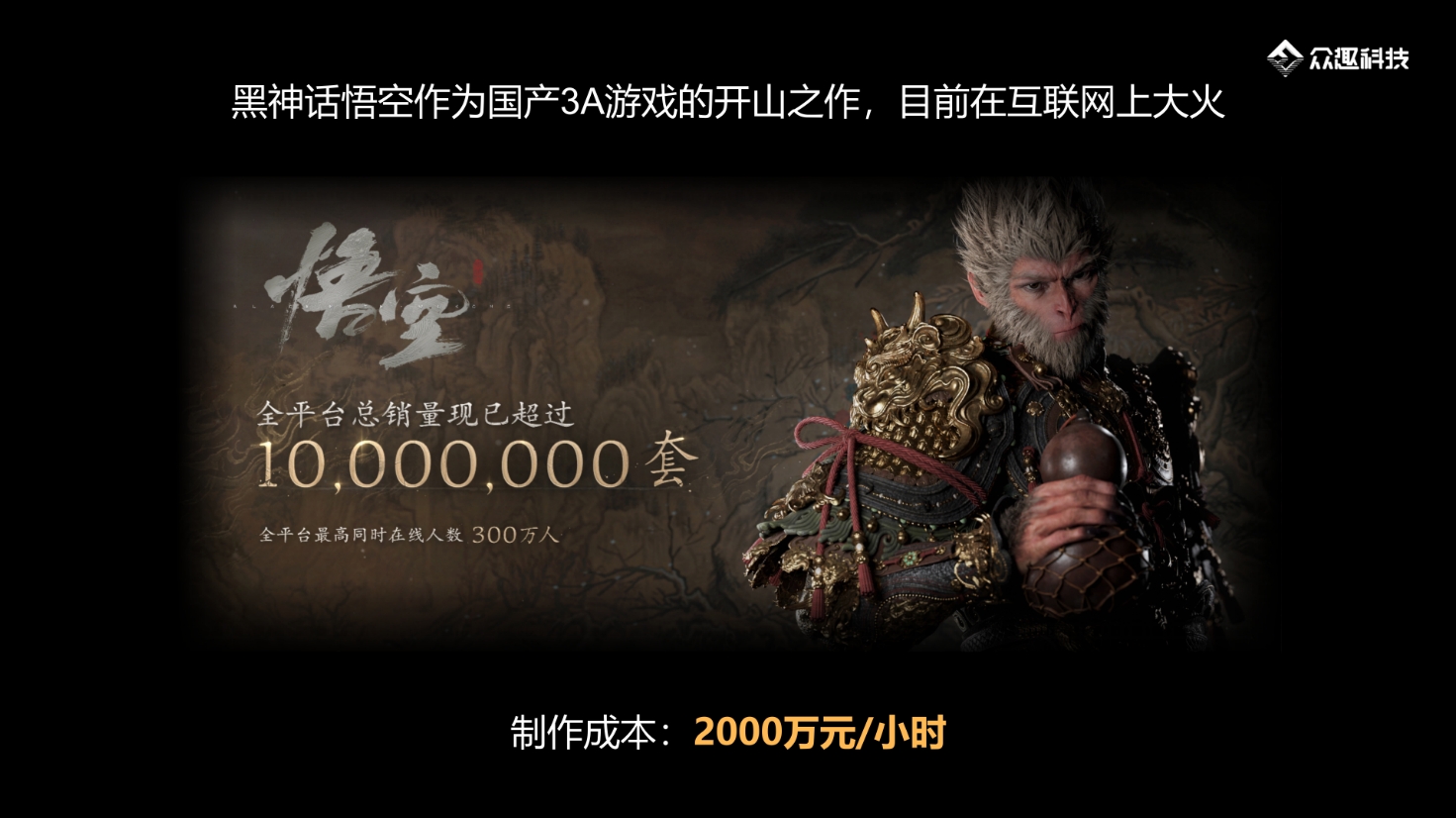 近期,備受期待的國產 3A 游戲《黑神話:悟空》正式上線,截止目前,該款游戲總銷量已超過 450 億元,每小時的開發成本更是高達 2000 萬元。得益于其強大的出圈效應,《黑神話:悟空》不僅成為全民關注焦點,同時也帶火了文旅、游戲直播等行業的發展。